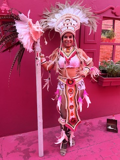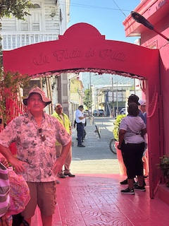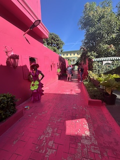 Our informative walk with our guide led us to Paseo Dona Blanca. Dona Blanca aka Bianca Franceschini was a poineer in the development of tourism industry in Puerto Plata in the 18th Century. Paseo Dona Blanca, is a fascinating concept, created in Puerto Plata, as a victorian style alley with all its walls, flooring and all the decorative items painted in shocking hot pink; It is used as an attractive backdrop for tourist photography, weddings, birthdays and other photo shoots.The manifestation of the Dominicans’ dedication to their culture, and history is throughout downtown. We, as cruise passengers, had limited access to sight seeing because of time constraints, but we saw people dressed in carnival costumes, dancing girls with pretty flowing outfit and lots of carnival masks displayed for us to see.