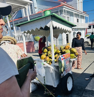 We walked around while our guide provided us with a lot of information about the carnival, traditional masks, dancing, and local musical instruments while a band played their traditional music, and pretty girls danced in colorful flowing dresses. We stopped at a coconut water cart, and the guide offered everyone a coconut with a straw to enjoy a refreshing drink of coconut water. After that they offered to cut the coconuts for us to eat soft jelly-like coconut flesh. I have to say that It was a great treat.
