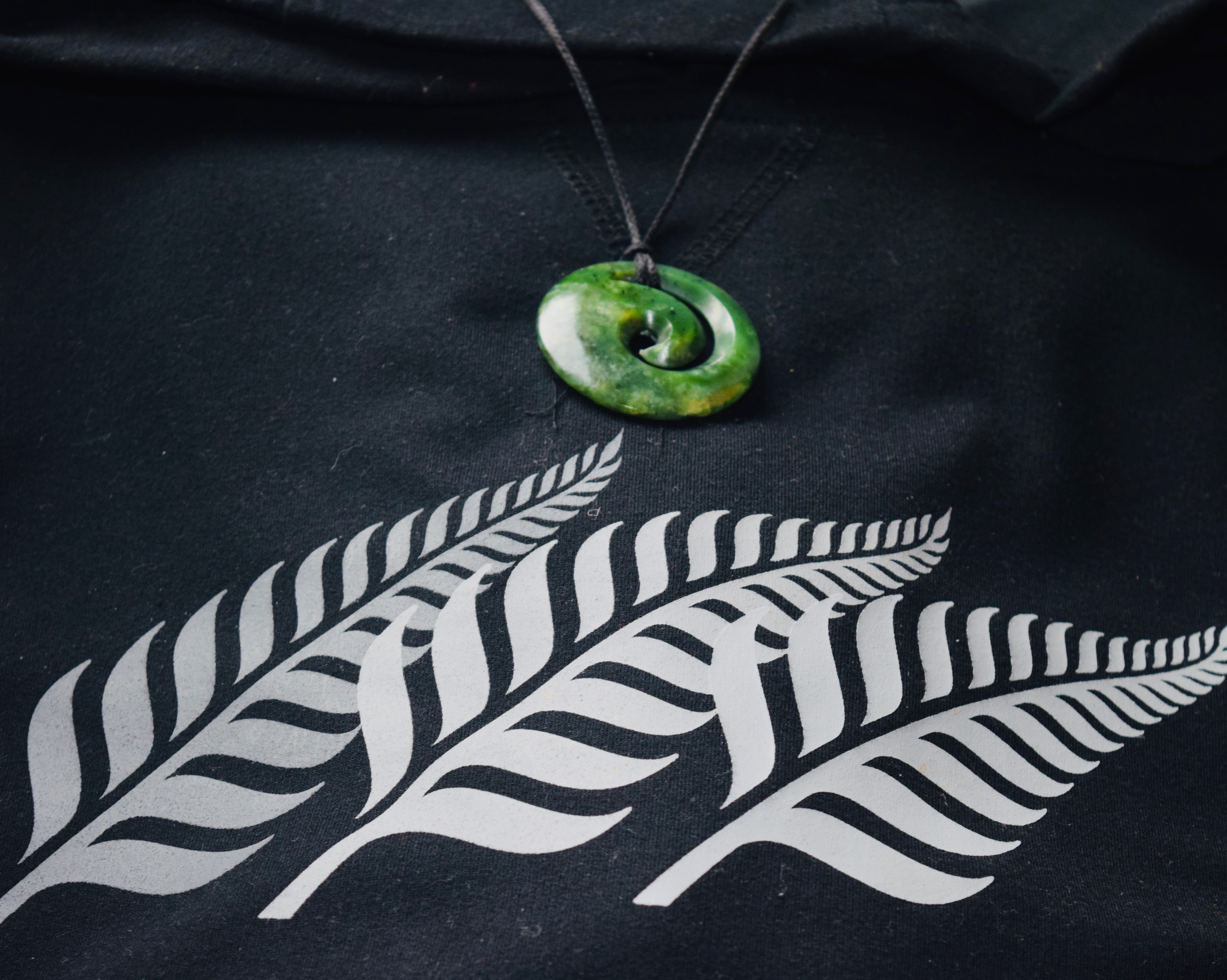 - Slver Fern on black sweat shirt,and koru pendant